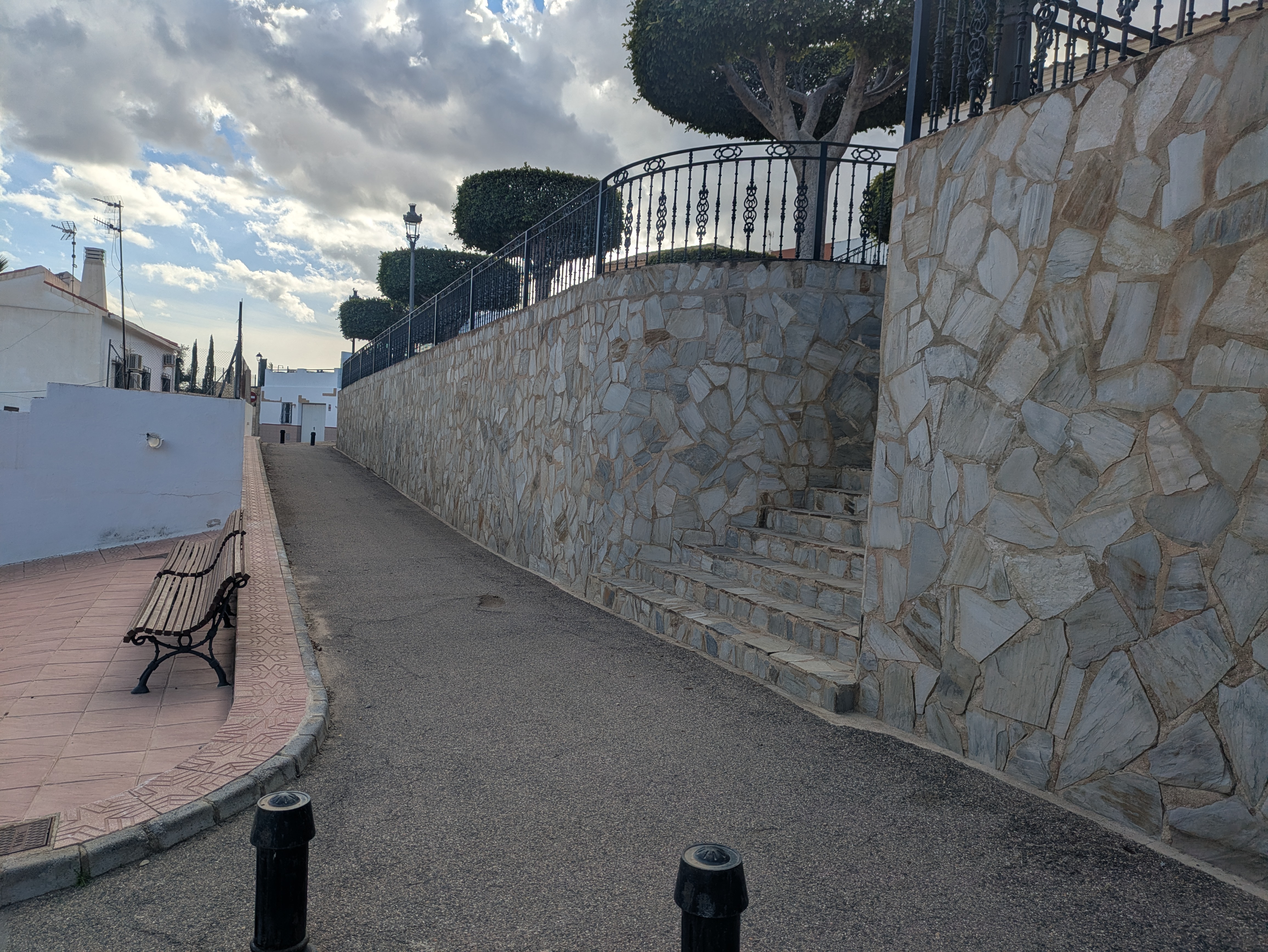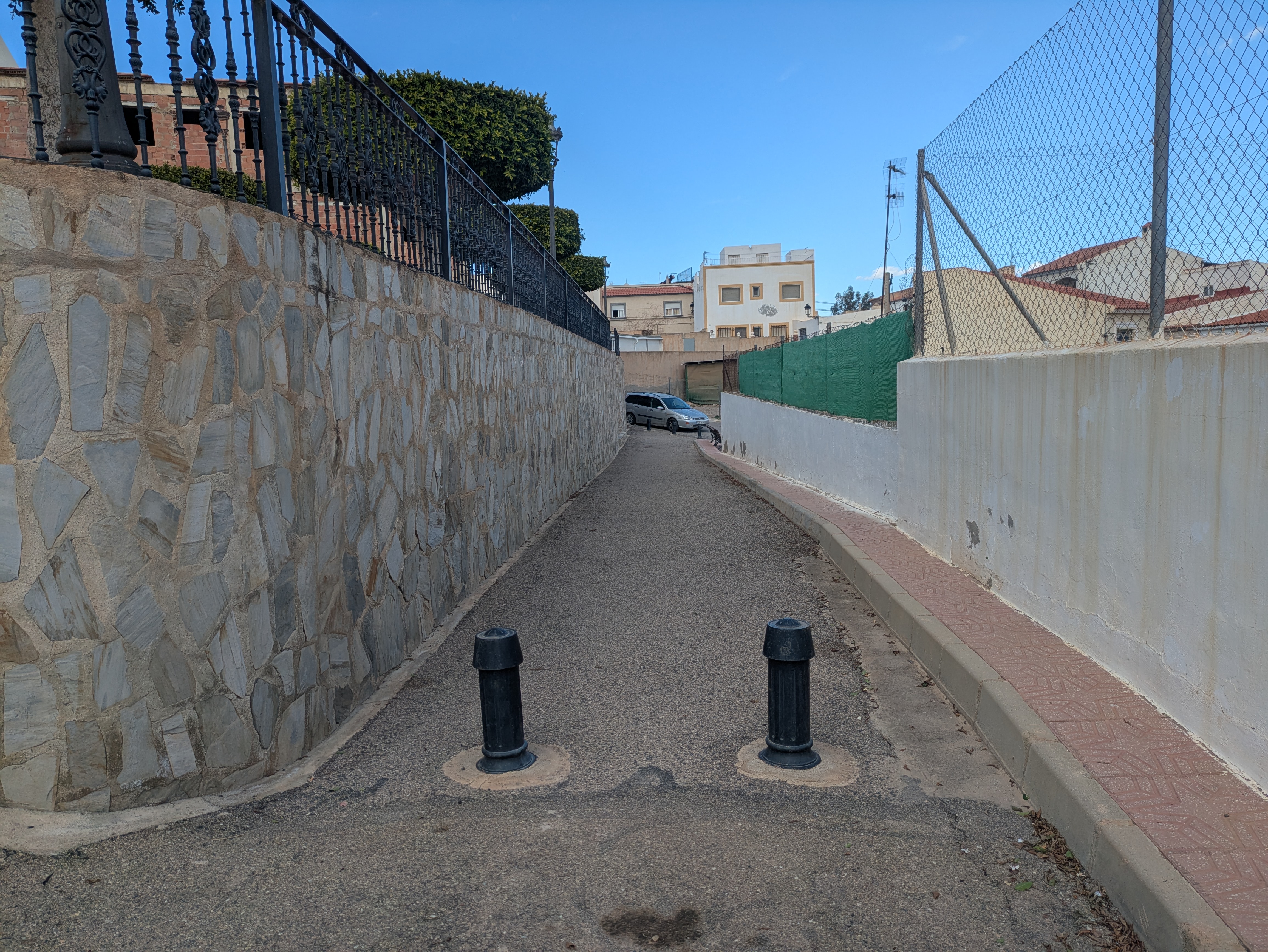 Callejón asfaltado peatonal con acerado en uno de los lados.