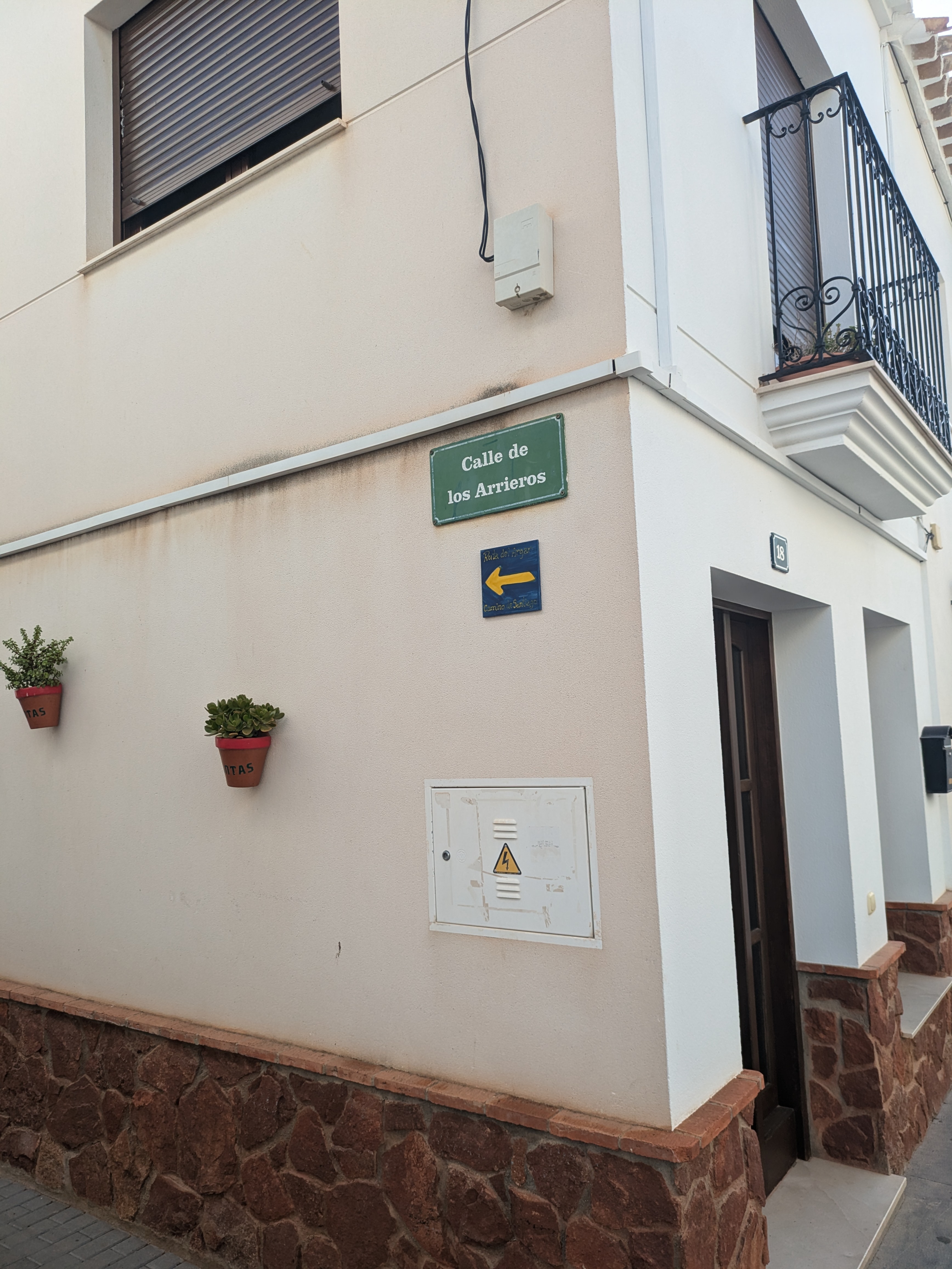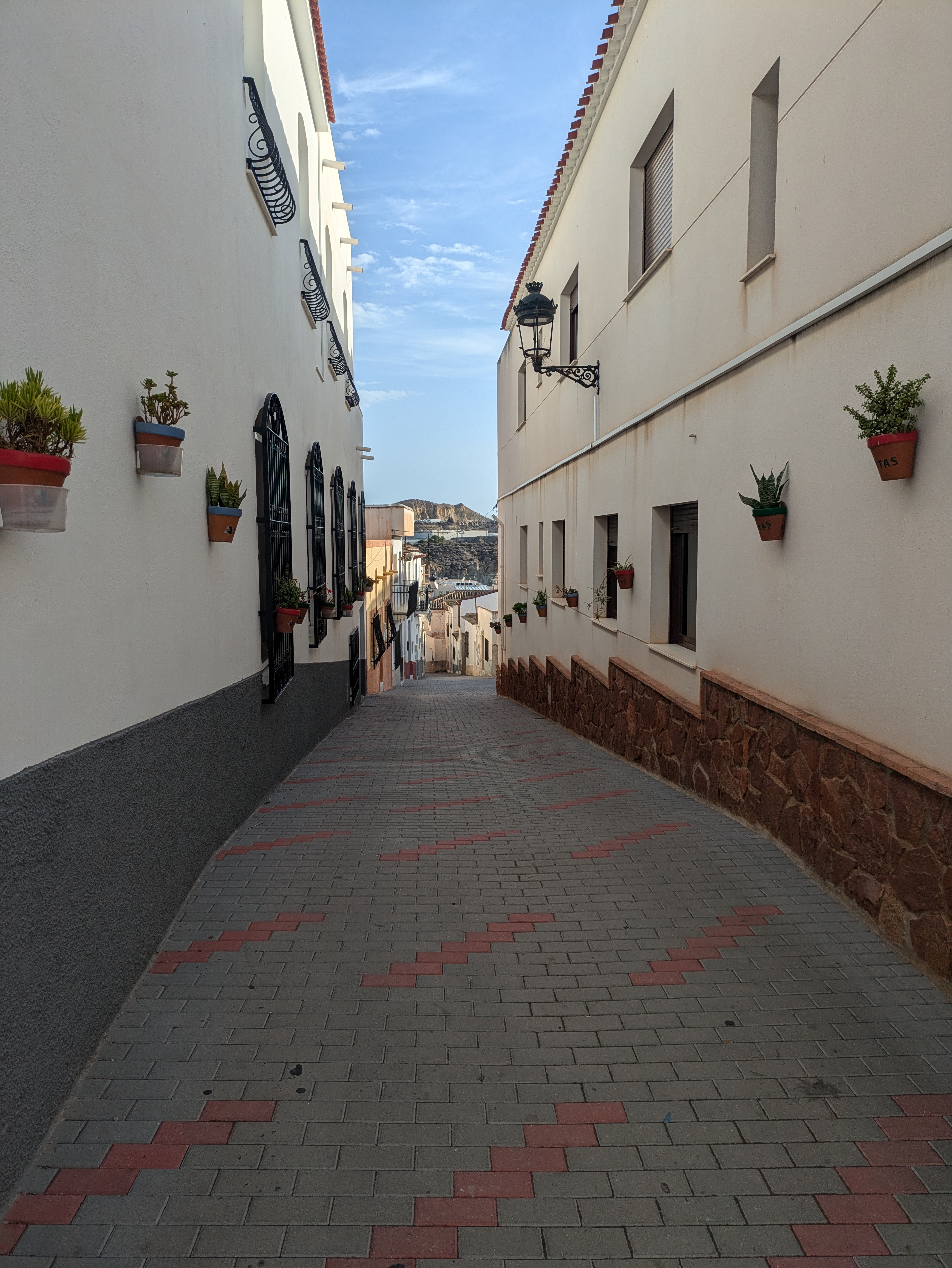 Calle adoquinada sin acerado. Cuenta con alumbrado público y decoración de jardinería en fachada.