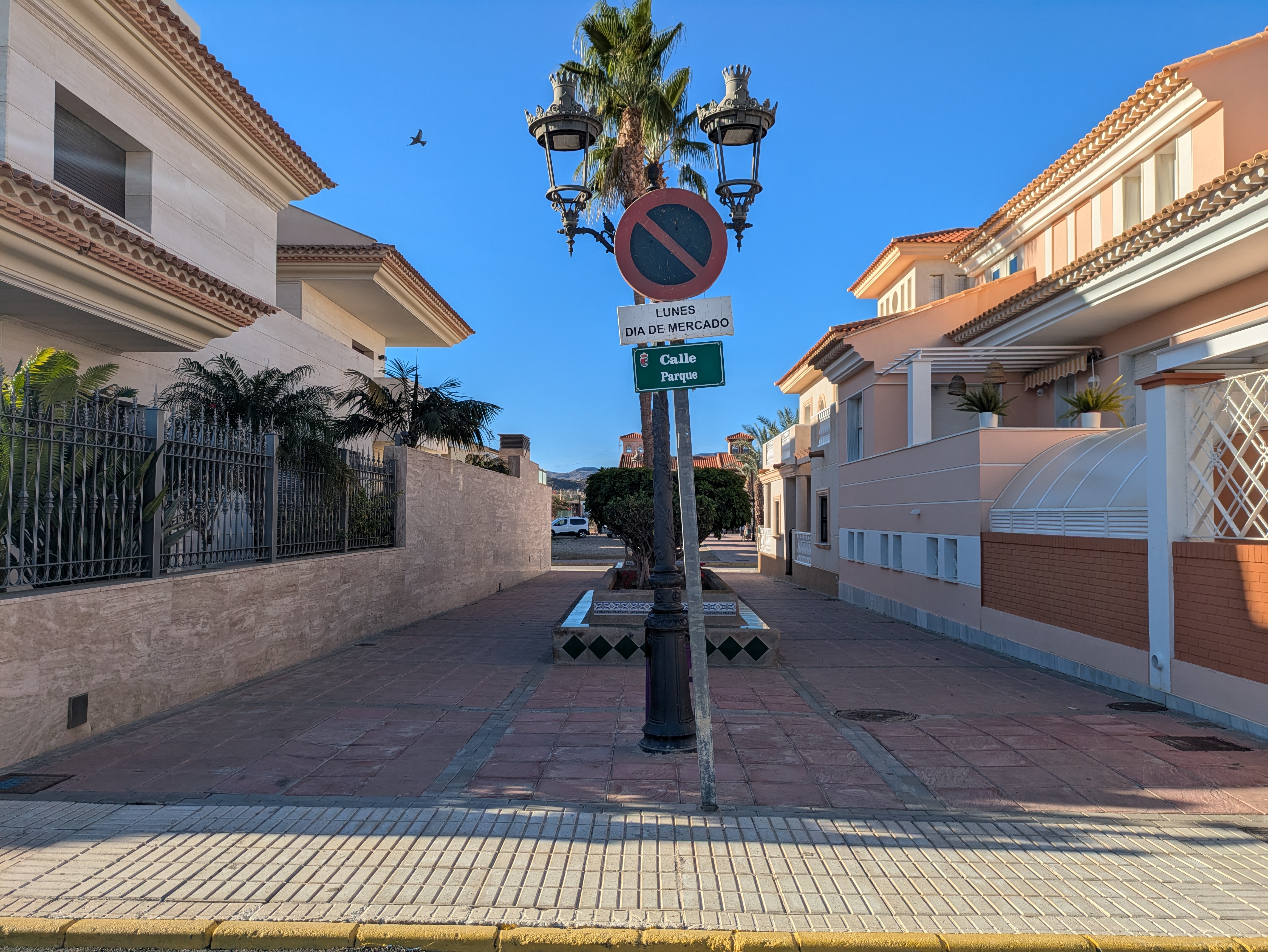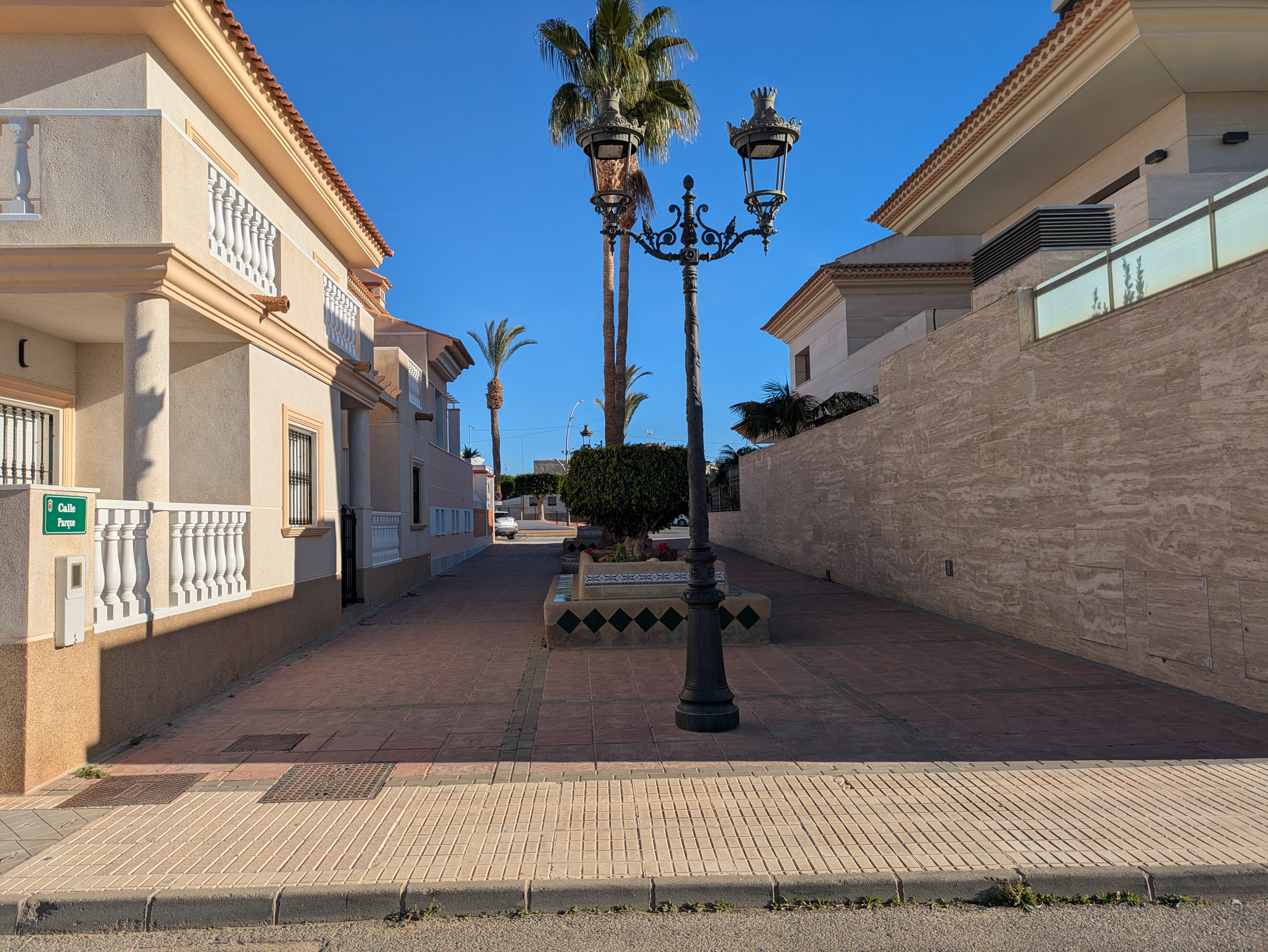 Calle peatonal enlosada con mobiliario urbano, alumbrado público y arbolado.
