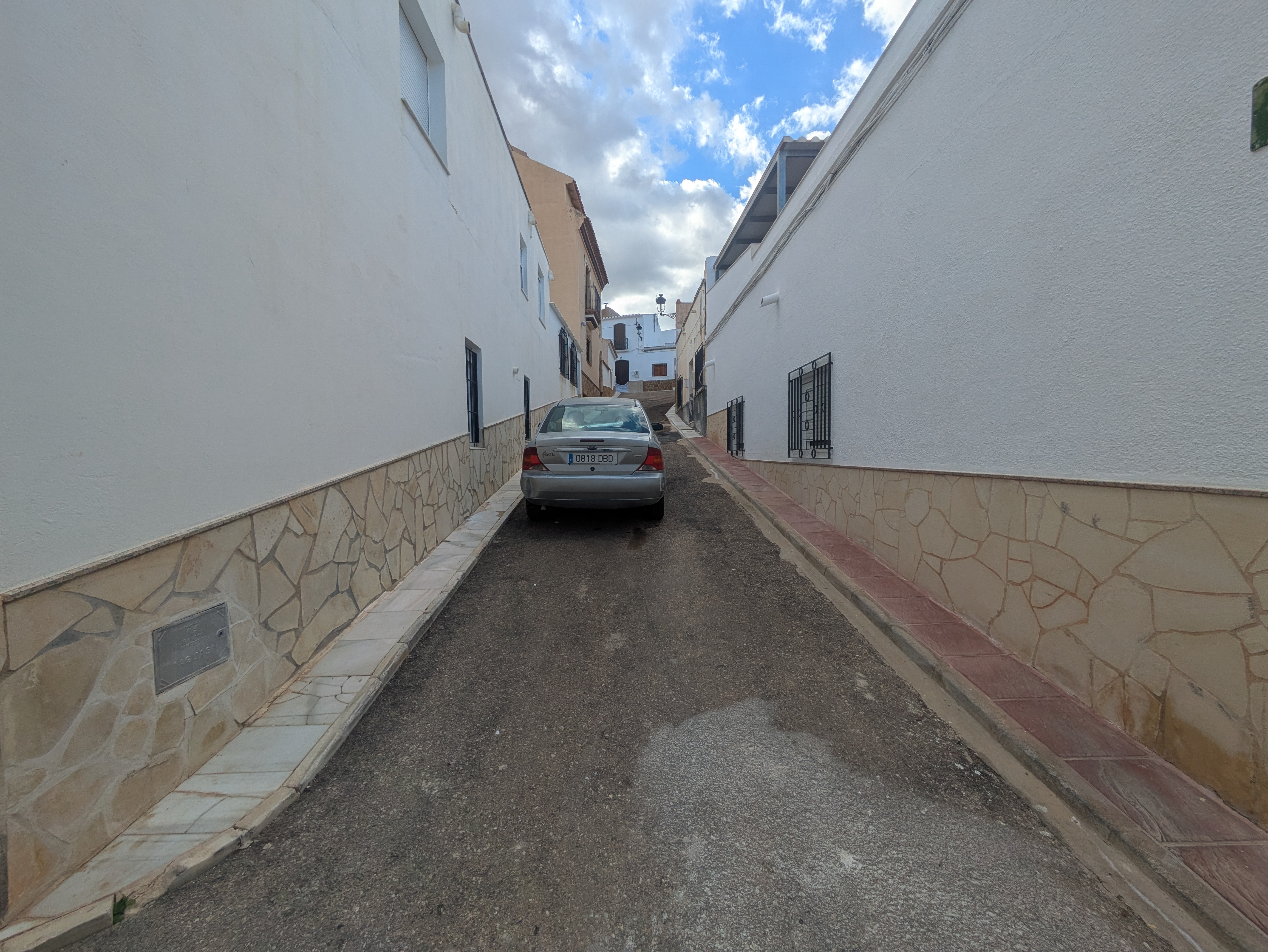 Calle con pendiente de un sólo sentido de circulación y acerado a ambos lados.