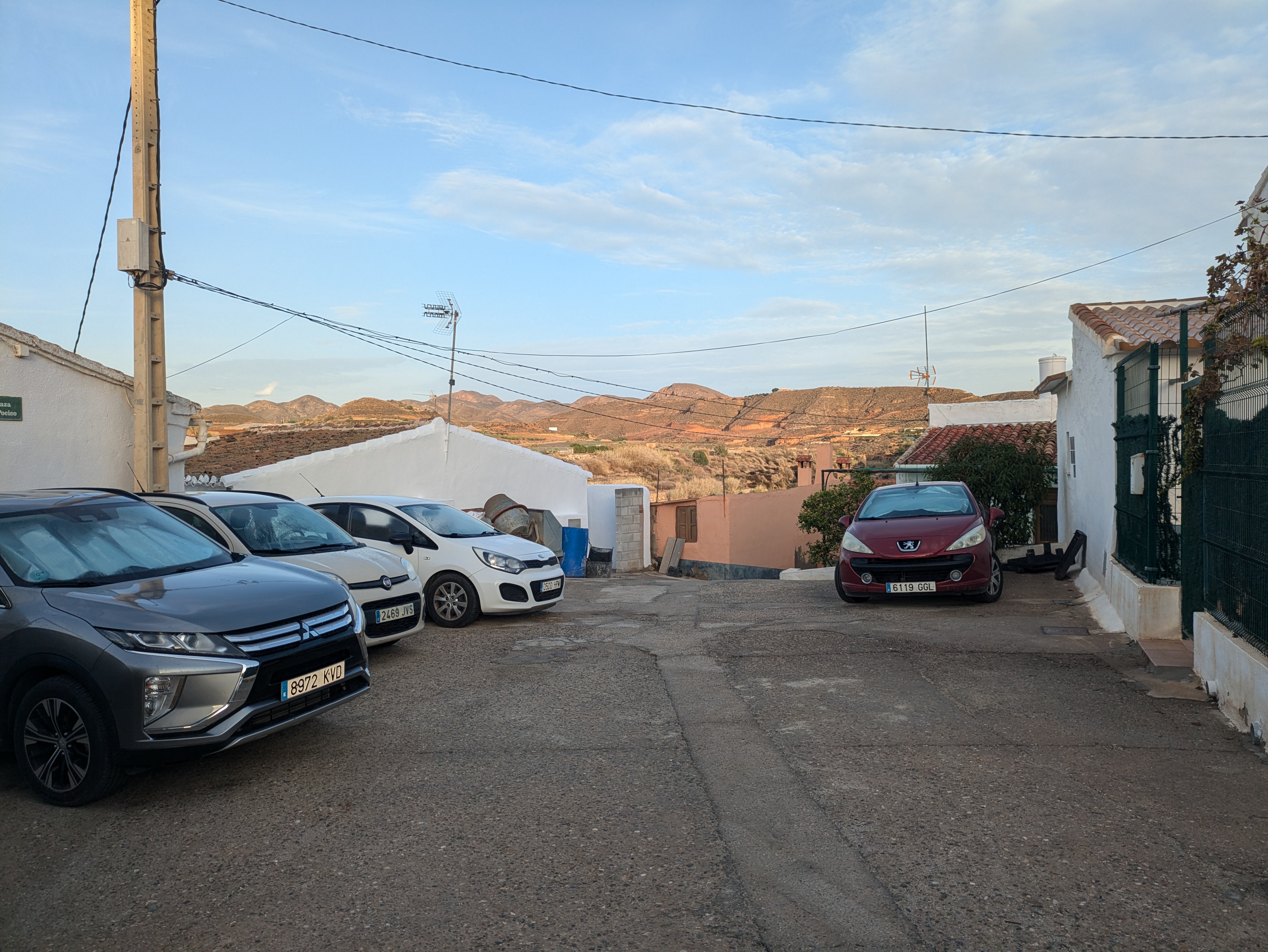 Plaza asfaltada sin delimitación utilizada para aparcamiento público.