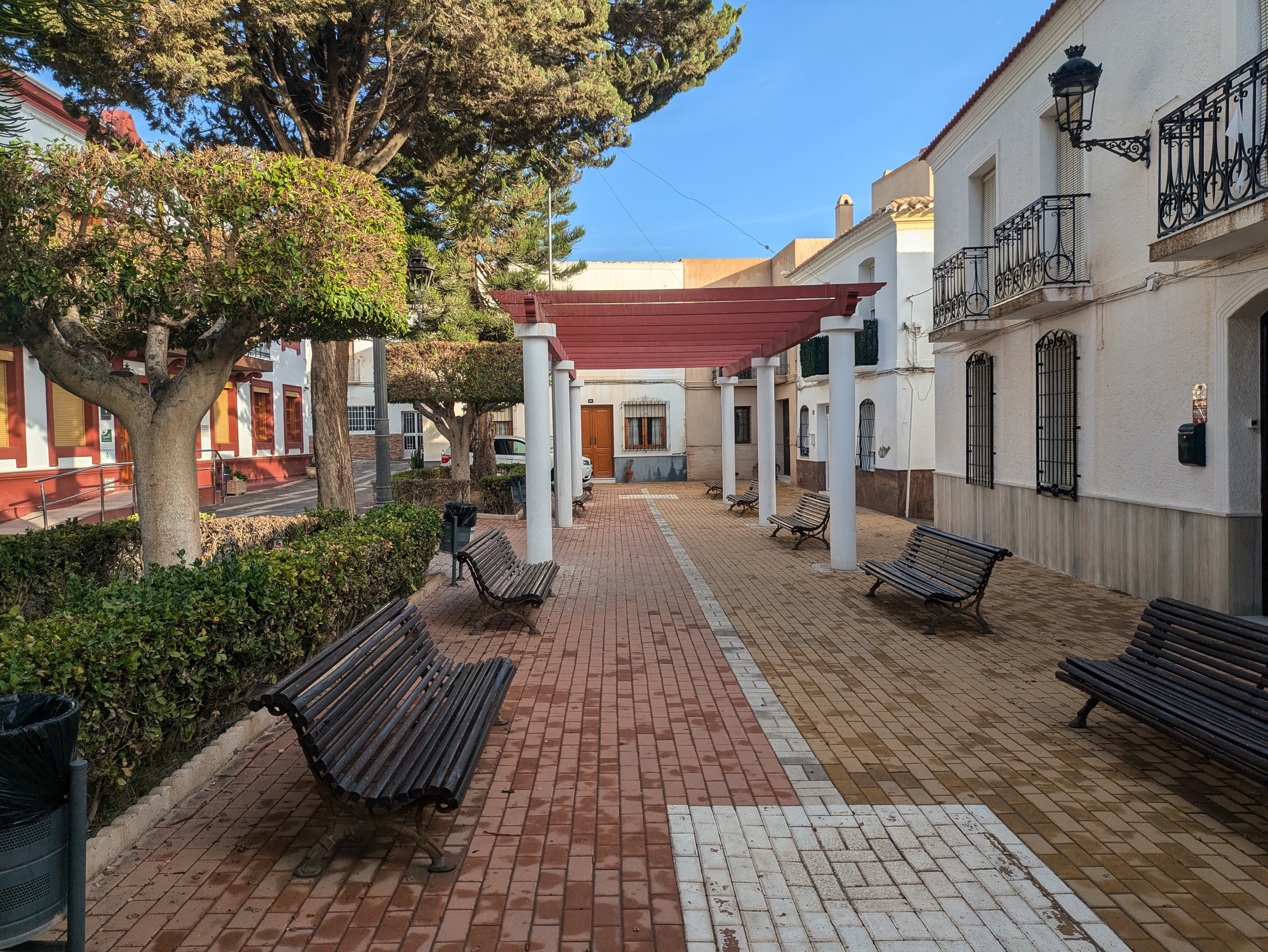 Plaza adoquinada con bancos, arbolado y pórtico para sombra. Esta plaza está ubicada enfrente de la actual Plaza Consistorial.